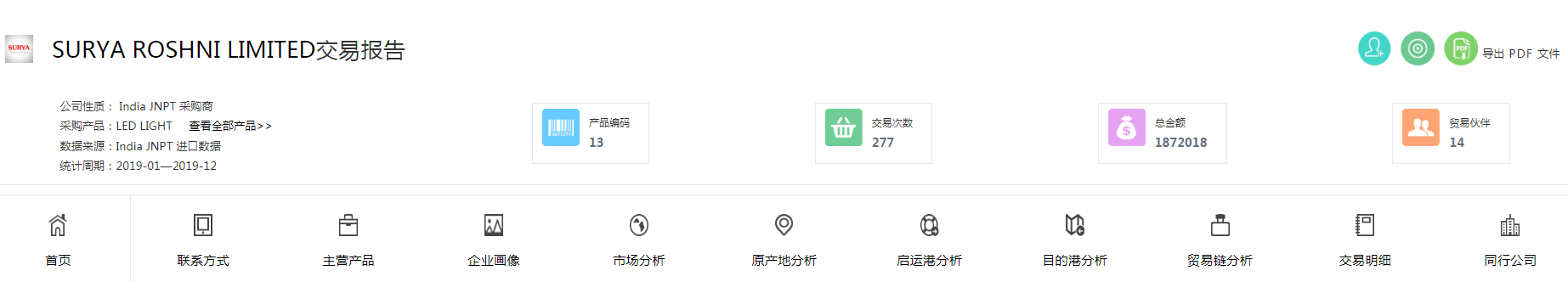 三:這個(gè)時(shí)候我們可以看到所有采購商的名稱以及基本情況,那么下面用序號2的SURYA ROSHNI LIMITED這個(gè)采購商舉例,直接點(diǎn)擊公司名稱進(jìn)入這個(gè)采購商查驗(yàn)報(bào)告頁面,也就是這個(gè)公司的的詳細(xì)分析頁面。