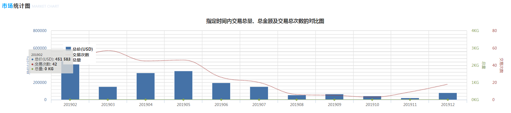 2.市場統(tǒng)計(jì)圖:是指采購商在搜索的時(shí)間段內(nèi)也就是19年全年的量價(jià)圖表,了解整體他的采購周期,頻率以及波動(dòng)等。