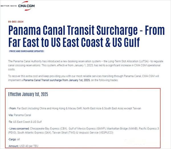 上周,達飛也發(fā)布公告,自 2025 年 1 月 1 日起征收“巴拿馬運河過境附加費”,目的是“收回額外成本”,并“持續(xù)保障經(jīng)巴拿馬運河的最可靠服務”。對于從遠東(涵蓋中國大陸和港澳地區(qū)、東北亞及東南亞)經(jīng)巴拿馬運河至美國東海岸和美國海灣的全部貨物,按 40 美金/TEU 征收,涉及 CBX、GMXP、MANB、PEX 3、SAX、TWS、VESPUCC 等相關航線。