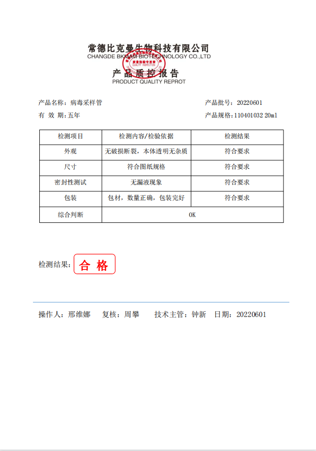 比克曼生物 病毒采樣管 20ml 110401032 20220601