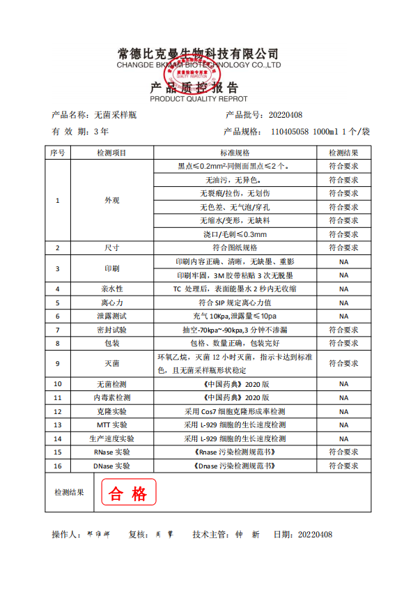 比克曼生物 無菌采樣瓶 1000ml 獨立裝 110405058 20220408