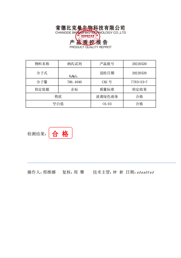 比克曼生物 納氏試劑 500ml 瓶 110702071 20220520