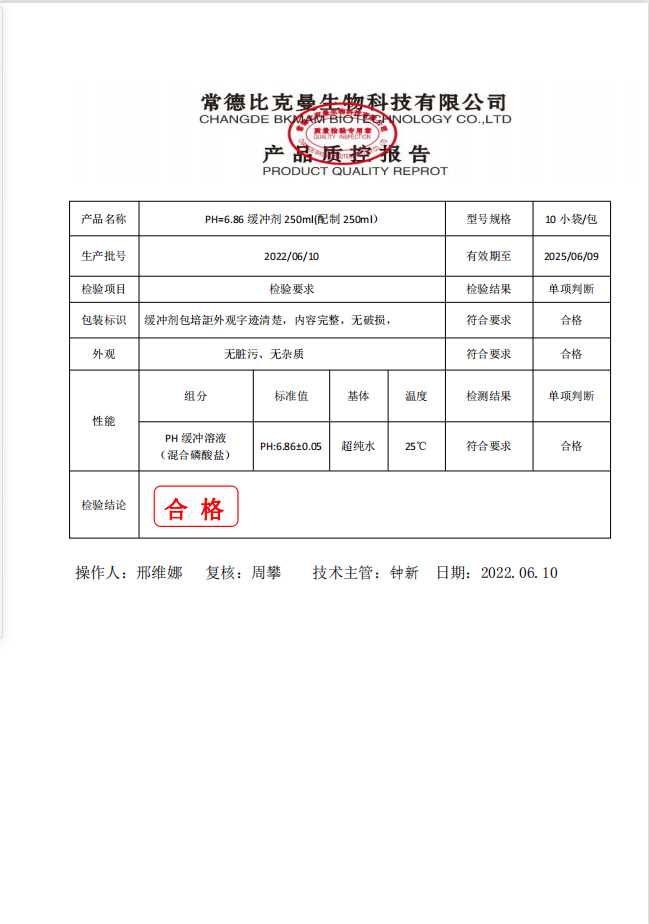 比克曼生物 PH緩沖劑 PH=6.86緩沖劑 250ml(配制250ml) 110702003 20220610