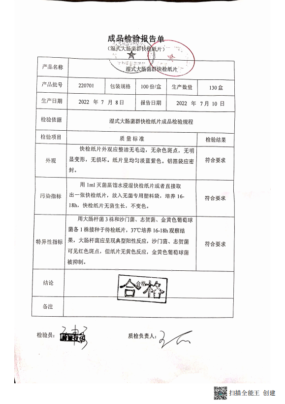 康華 濕式大腸菌群快檢紙片 100份盒 160711012 220701