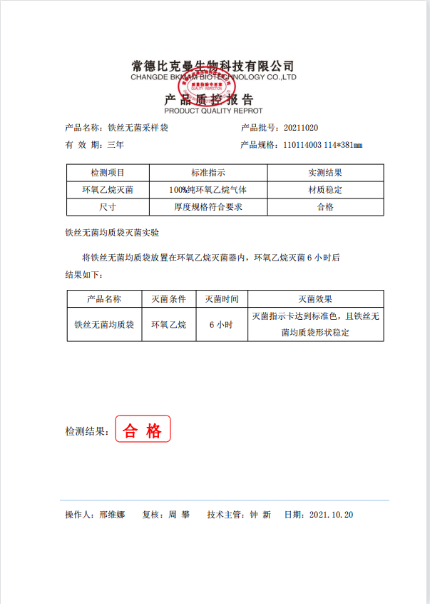 110114003 bkmamlab 鐵絲無菌采樣袋114x381mm帶書寫區(qū)域(1000ml)100個裝 20211020