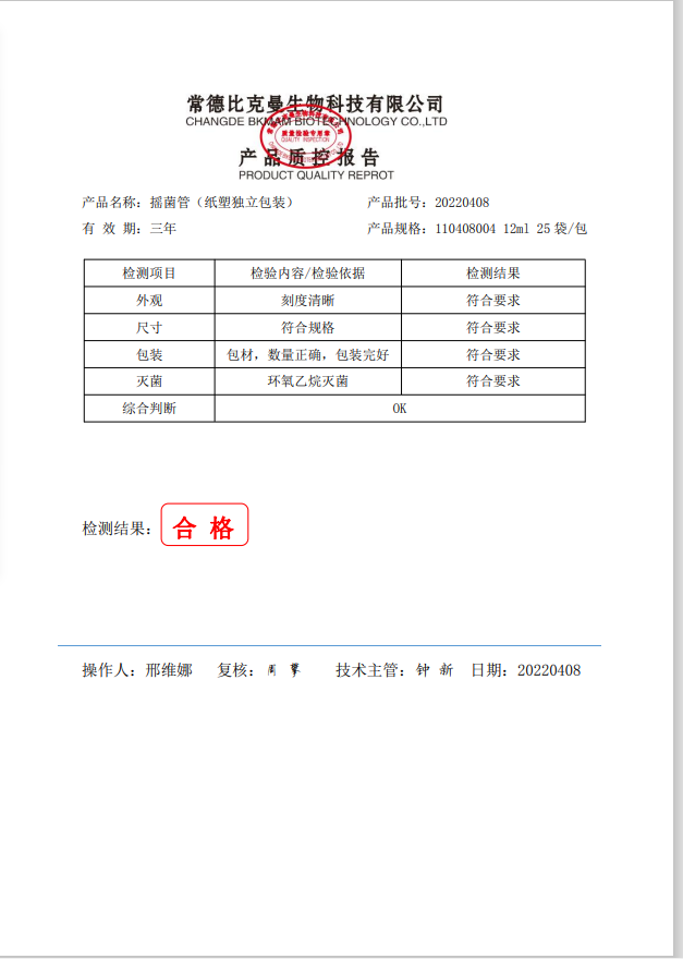 比克曼生物 搖菌管(12ml 紙塑獨立包裝)1個袋 25袋包 110408004 20220408