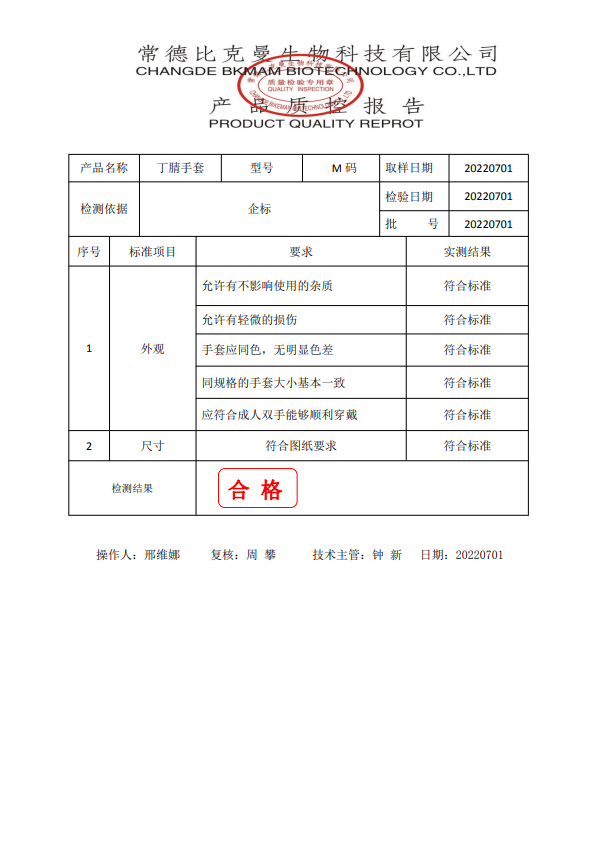 比克曼生物 丁腈手套 M碼 50雙盒 110601013 20220701 質(zhì)檢報告