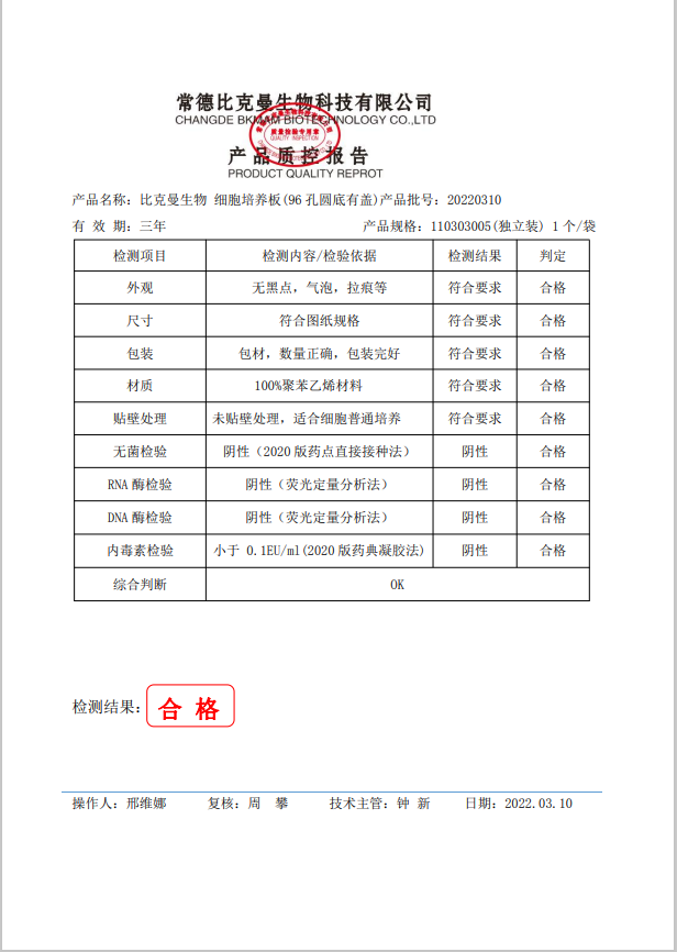 比克曼生物 細(xì)胞培養(yǎng)板(96孔圓底有蓋)(獨(dú)立裝) 1個(gè)培裝 110303005 20220310