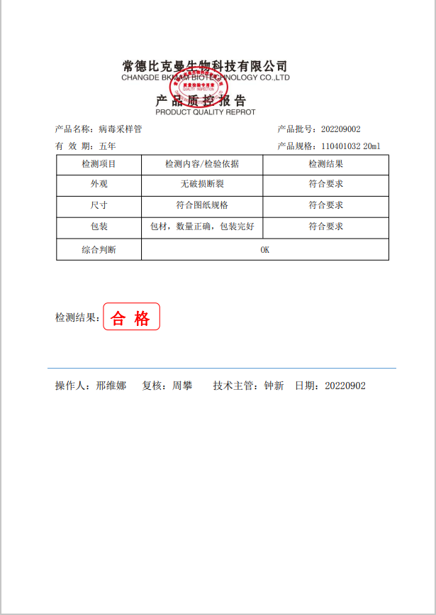比克曼生物 病毒采樣管(棉蓋,不擰蓋,非滅菌) 20ml 110401032 202209002