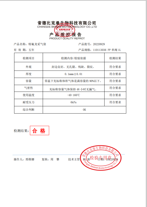 比克曼生物 特氟龍采氣袋 PP 單閥 1L 110113036 20220929