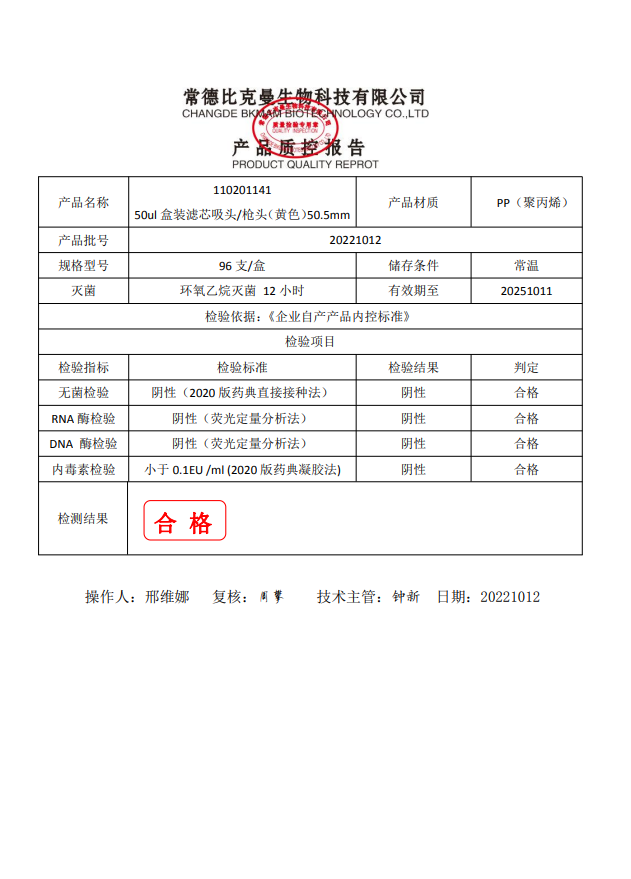 110201141 50ul 盒裝濾芯吸頭槍頭(黃色)50.5mm 96支裝 20221012