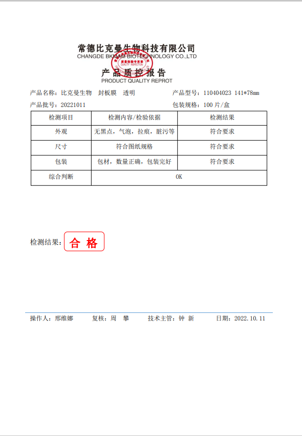 比克曼生物 比克曼生物 熒光定量PCR封板膜 141x78mm100片盒 110404023 20221011