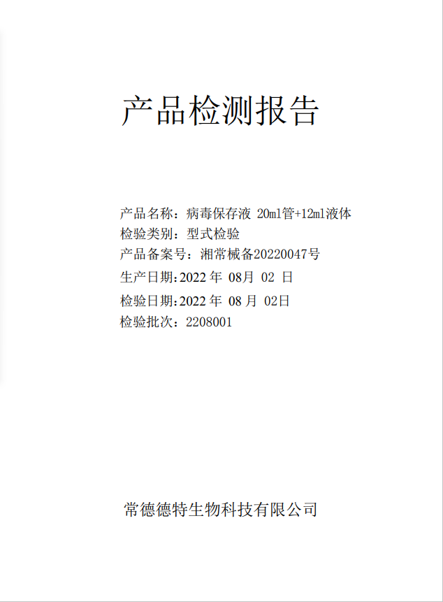 德特 病毒保存液 20ml管+12ml液體(C-03滅活型)質(zhì)檢報(bào)告-生產(chǎn)批號(hào) 2208001 生產(chǎn)日期 20220802