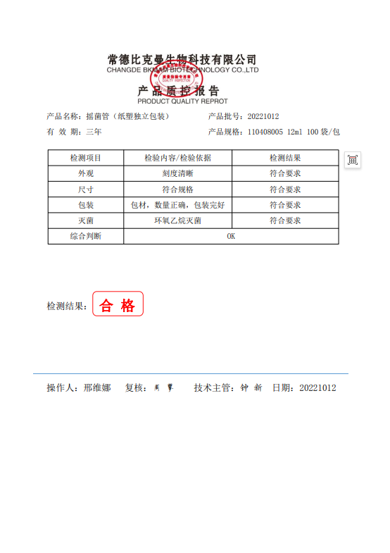 110408005 搖菌管(12ml 紙塑獨立包裝)1個袋 100袋包 20221012