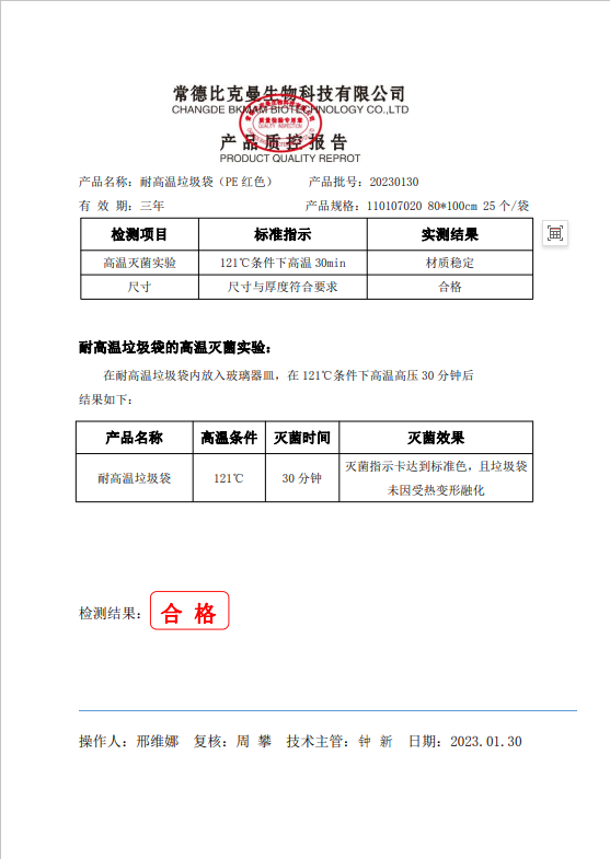 110107020 比克曼生物 耐高溫垃圾袋 紅色 80x100cm (PE復(fù)合膜材質(zhì)) 25個(gè)袋 20230130