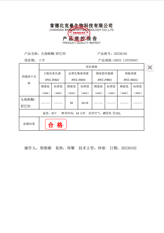 110705047 比克曼生物 頭孢哌酮 舒巴坦 105UG 20片瓶 20230102