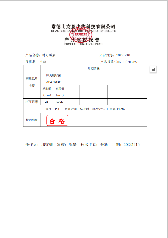 110705027 比克曼生物 林可霉素 2UG 20片瓶 20221216