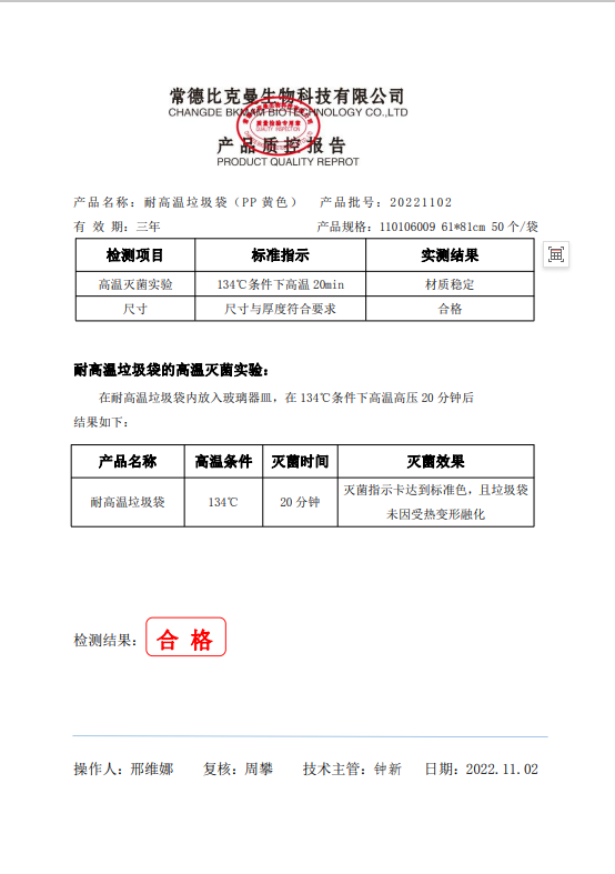 110106009 比克曼生物 耐高溫垃圾袋 黃色 61x81cm (PP復(fù)合膜材質(zhì)) 50個(gè)袋 20221102