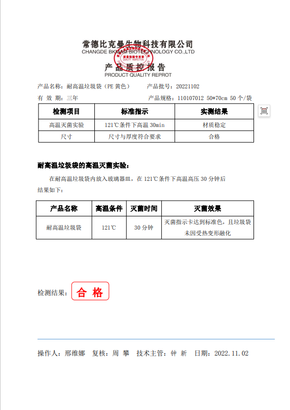 110107012 比克曼生物 耐高溫垃圾袋 黃色 50x70cm (PE復(fù)合膜材質(zhì)) 50個袋 20221102