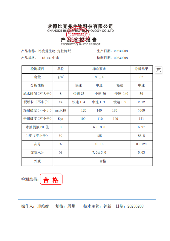 110416008 比克曼生物 定性濾紙 18cm(中速) 100張盒 20230208