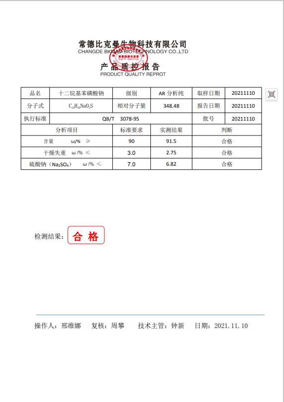 110702044 比克曼生物 十二烷基苯磺酸鈉 AR分析純 500g瓶 20211110