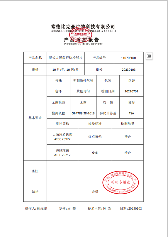 110708001 比克曼生物 濕式大腸菌群快檢紙片 100片盒 20230103