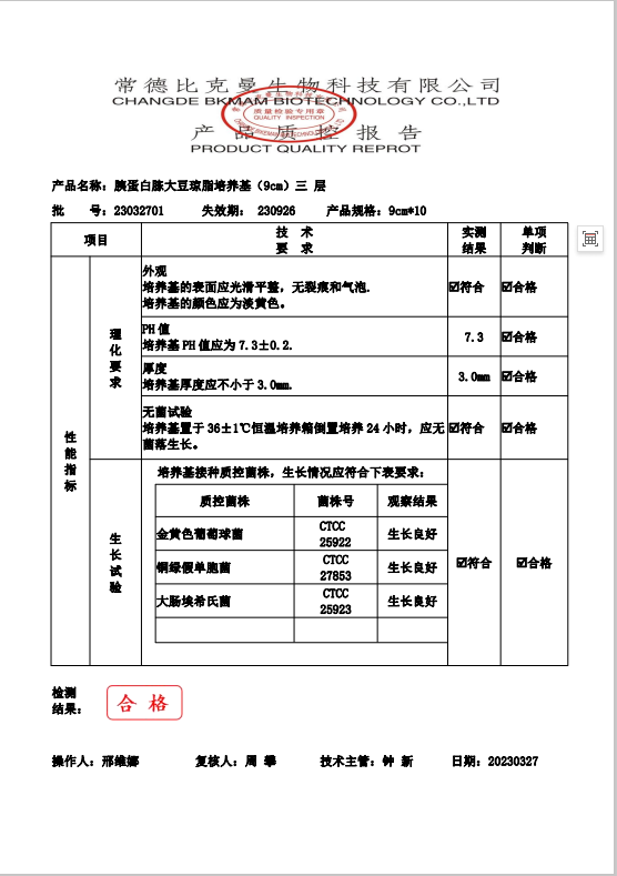 110704022 比克曼生物 胰蛋白胨大豆瓊脂(三層包裝) TSA瓊脂平板 9cm 10個袋 23032701