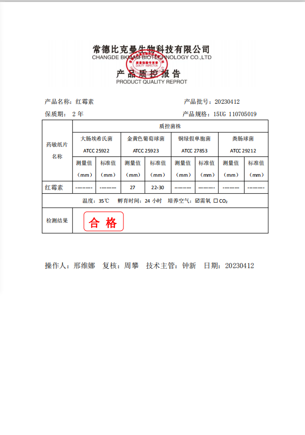 110705019 比克曼生物 紅霉素 15UG 20片瓶 20230412