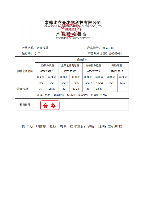 110705033 比克曼生物 諾氟沙星 10UG 20片瓶 20230412