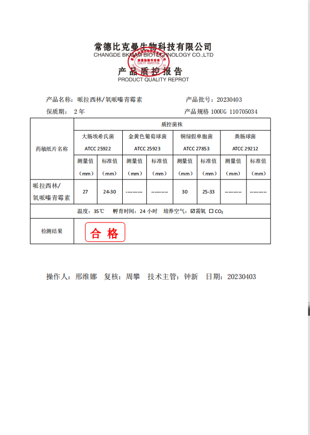 110705034 比克曼生物 哌拉西林 100UG 20片瓶 20230403