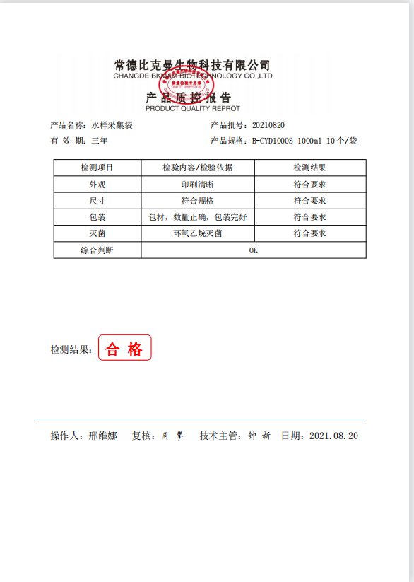 水樣采集袋 (含硫) 1000ml 10個袋 B-CYD1000S 20210820