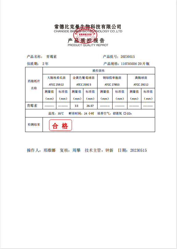 110705036 比克曼生物 青霉素 10UG 20片瓶 20230515
