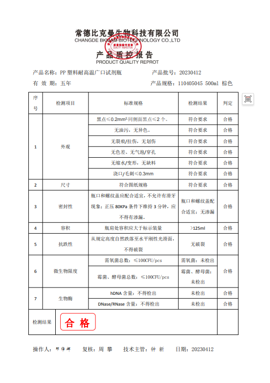 110405045 比克曼生物 pp塑料耐高溫廣口試劑瓶 500ml 棕色 10個(gè)袋 20230412