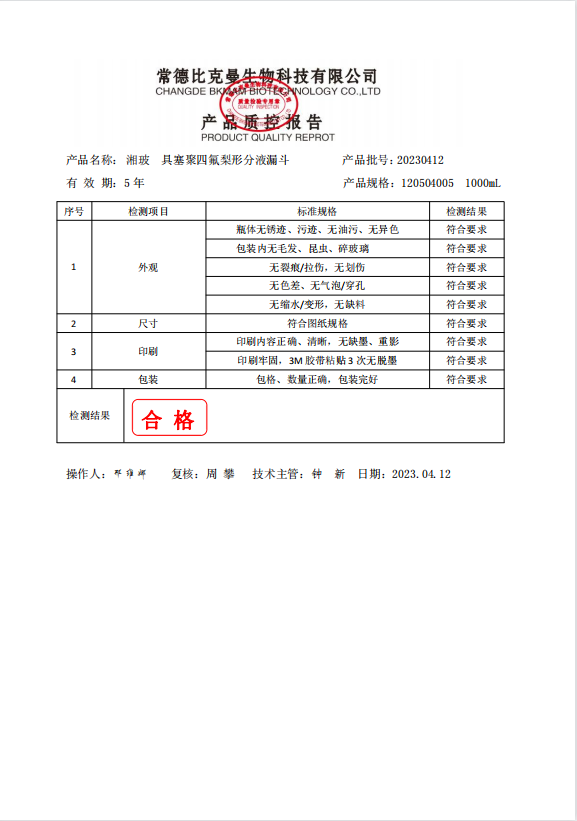 120504005 湘玻 具塞聚四氟梨形分液漏斗 1000ml(玻璃) 2個盒 20230412