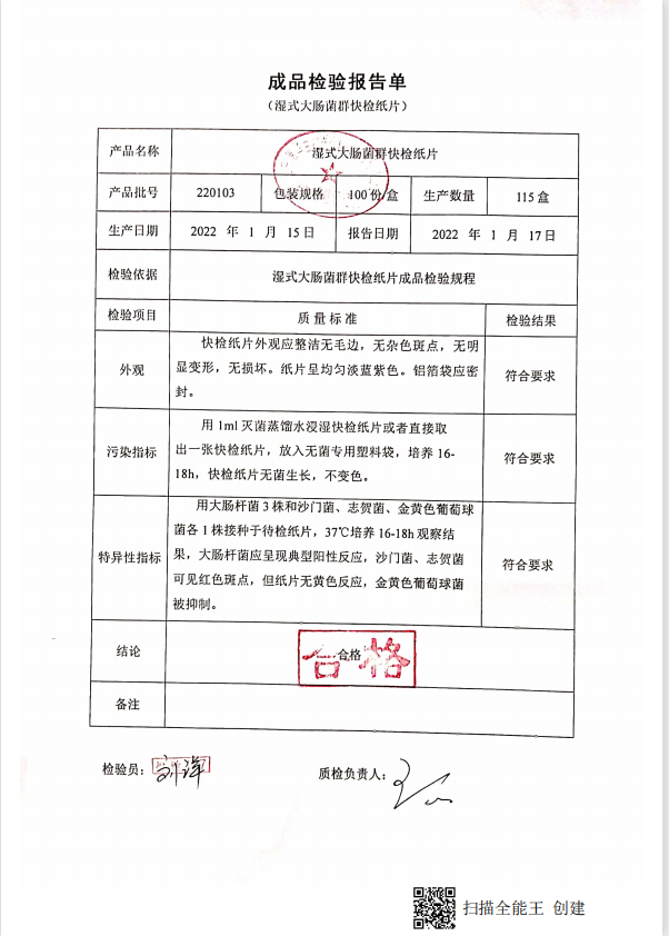 濕式大腸菌群快檢紙片 100份盒 160711012 220103