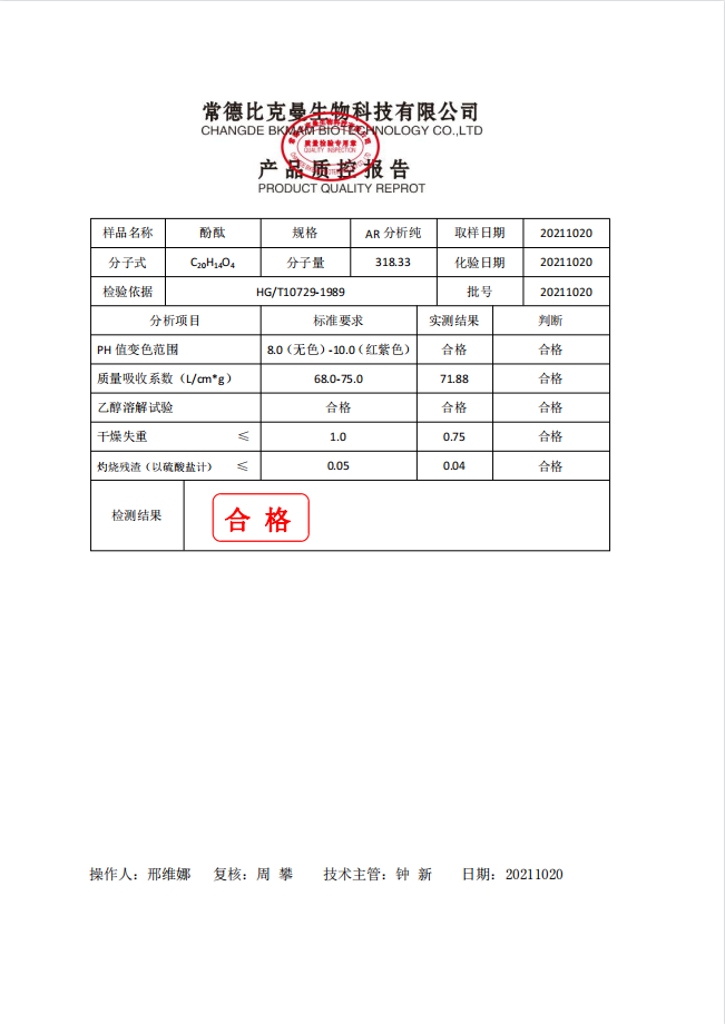 比克曼生物 酚酞 AR分析純 25g瓶 110702012 20211020