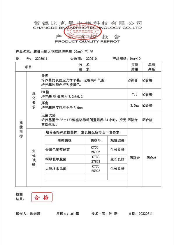 比克曼生物 胰蛋白胨大豆瓊脂(三層包裝) TSA瓊脂平板 9cm 10個袋 110704022 202203011