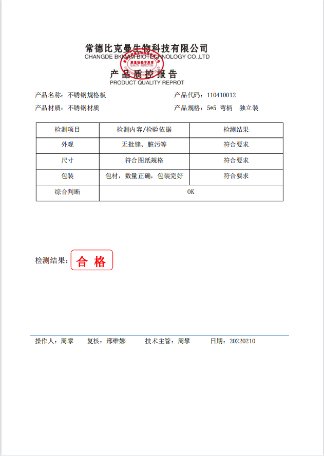 比克曼生物 不銹鋼規(guī)格板 5x5 彎柄 獨(dú)立裝 110410012 20220210