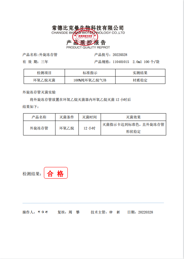 外旋冷凍管 (凍存管) 2.0ml 100個袋 110401015 20220328 滅菌報告