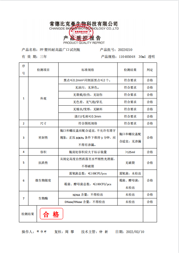 比克曼生物 PP塑料耐高溫廣口試劑瓶 30ml 110405048 20220210