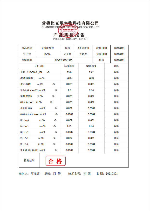 比克曼生物 無水碳酸鉀 AR分析純 500g瓶 110702054 20210301